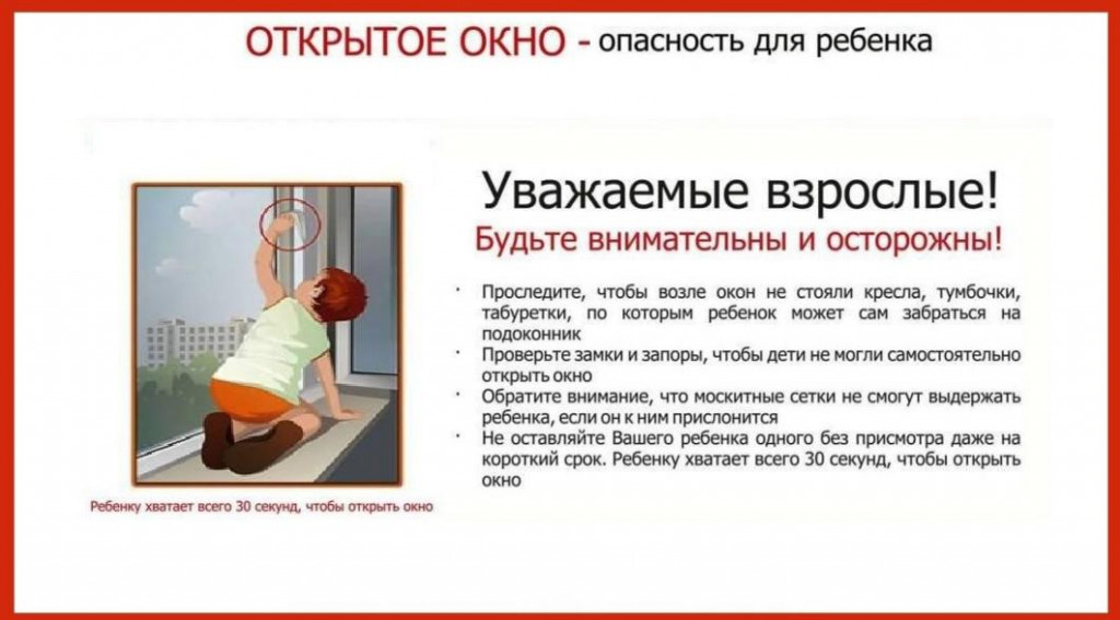 Каждый год от падений с высоты гибнет огромное количество детей, и не которые из Вас забывают о том, что открытое окно может быть смертельно опасно для ребёнка. Никогда не держите окна открытыми, если дома ребёнок! Вам кажется, что Вы рядом, но секунда, на которую Вы отвлечетесь, может стать последней в жизни Вашего ребёнка!